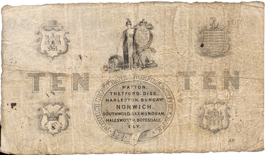 Norwich Crown Bank & Norfolk & Suffolk Bank 1869 £10 banknote Outing 1606l