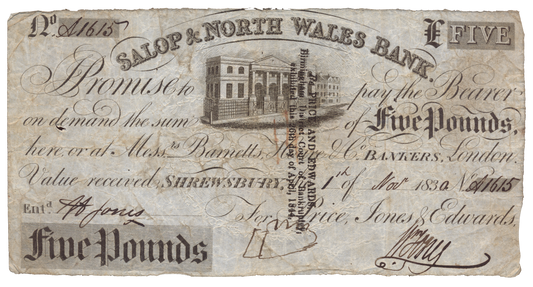 Salop & North Wales Bank Shrewsbury 1830 £5 banknote Outing 1962b