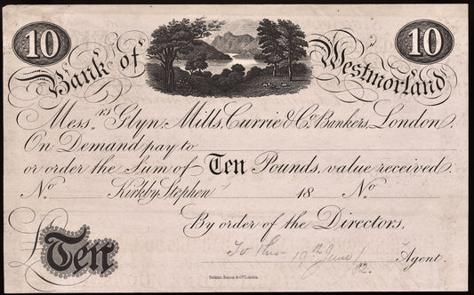 Westmoreland (Bank of) 18__ £10 banknote Outing 1082variation