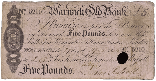 Warwickshire Old Bank 1830 £5 banknote Outing 2280f