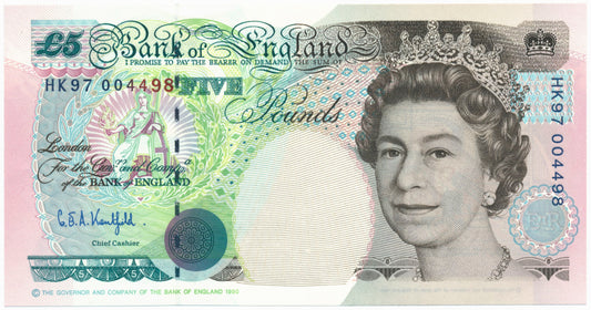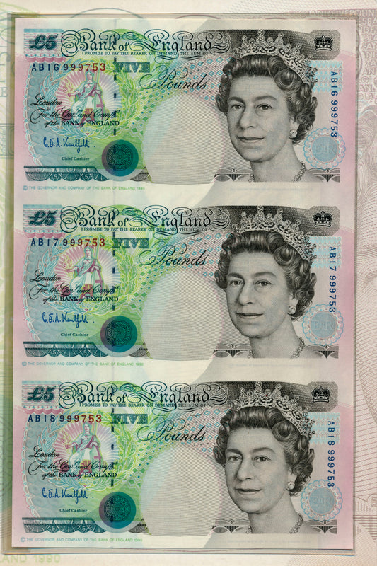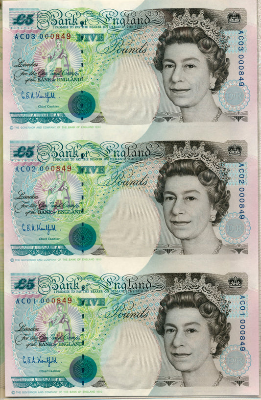 C107 1993 Debden presentation set Uncut trio of £5 notes (B363) the last printed on web presses