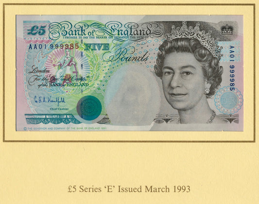 C108 1993 Debden presentation set Uncut trio of £5 notes (B364) the first printed on new sheet-fed presses