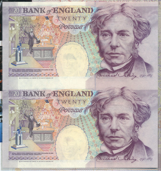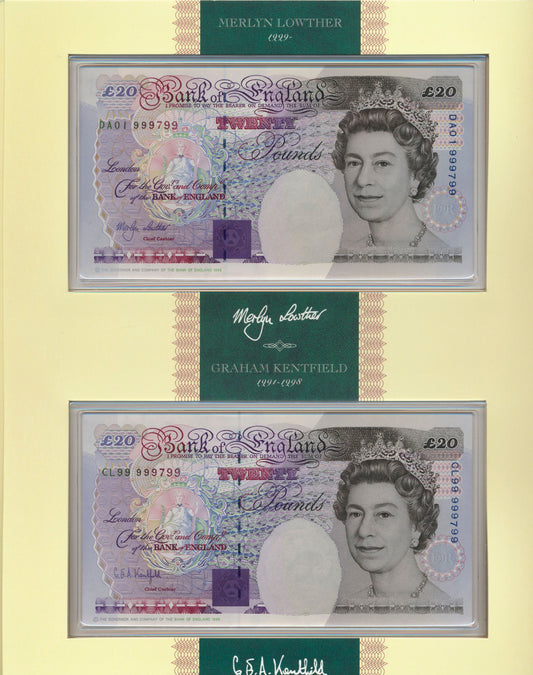 C144 1999 Debden presentation set First Lowther £20 (B384) and Last Kentfield £20 (B375)