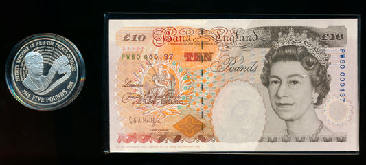 C131 1998 Debden presentation set Prince of Wales's 50th birthday £10 B369 (PW50) and £5 silver proof crown