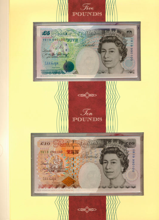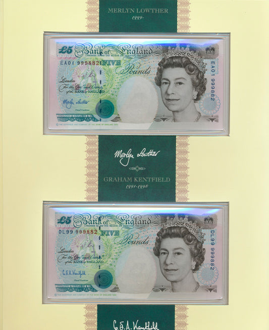 C142 1999 Debden presentation set First Lowther £5 (B380) and Last Kentfield £5 (B364)