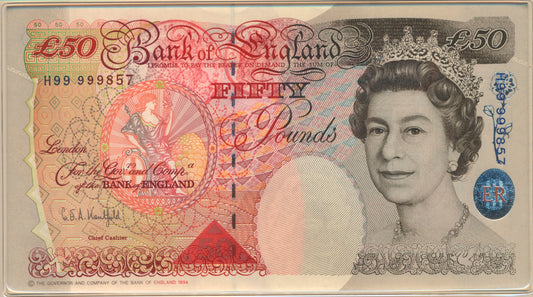 C145 1999 Debden presentation set First Lowther £50 (B385) and Last Kentfield £50 (B377)