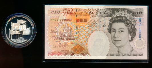 C120 1996 Debden presentation set HM Queen's 70th birthday £10 B369 (HM70) and £5 silver proof crown