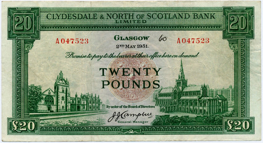 SCOTLAND P.193a SC315a 1951 Clydesdale & North of Scotland Bank £20 VF A