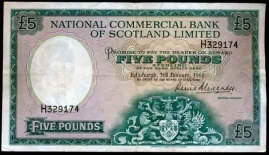 SCOTLAND P.270 SC612 1961 National Commercial Bank of Scotland £5 VF H