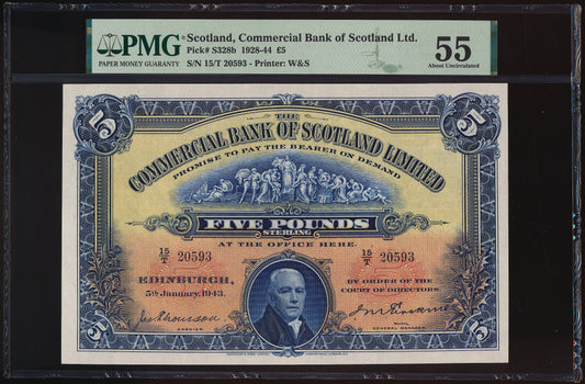 SCOTLAND P.S328b SC413d 1943 Commercial Bank of Scotland £5 AUNC55