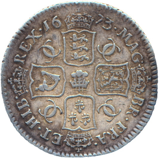 1673 Shilling Second bust Plume below bust S3376 ESC 525 Extremely rare (R3) AVF/VF