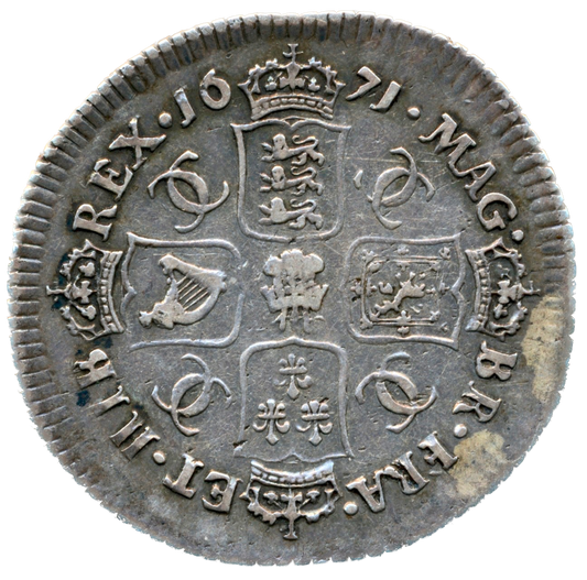 1671 Shilling Second bust Plume below bust S3376 ESC 520 Very rare (R2) GVF