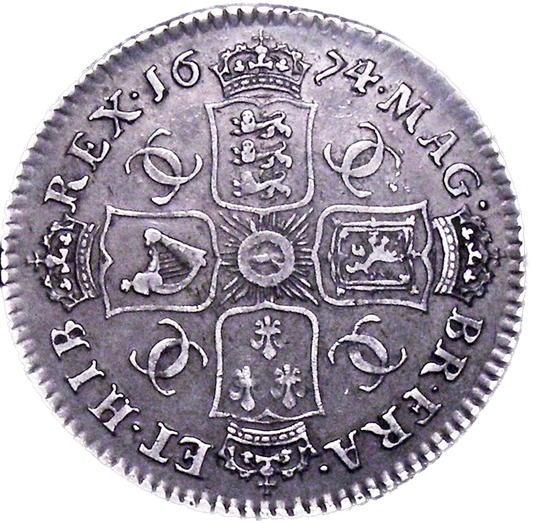 1674/3 Shilling Second bust variety S3375 ESC 527 Very rare (R2) GVF