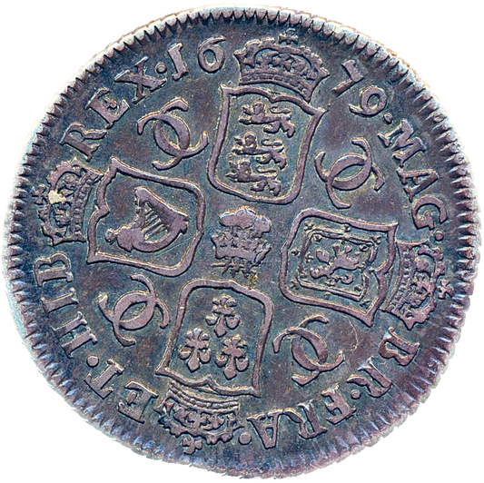 1679 Shilling Second bust Plume below bust S3376 ESC 548 Extremely rare (R3) AVF/VF