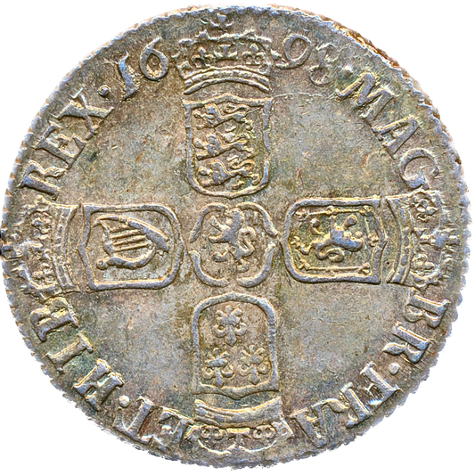 1696/5 Sixpence First bust S3520 ESC 1207 E over C in GVLIELMVS Very rare (R2) EF