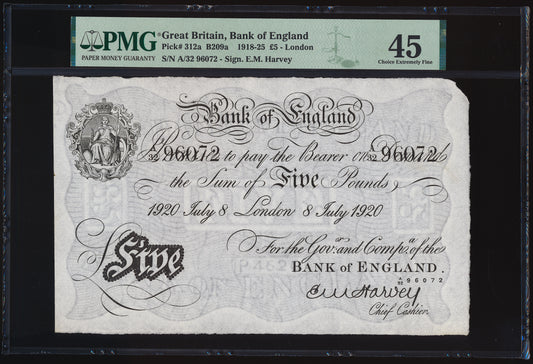 ENGLAND P.312a B209a 1920 Harvey £5 A32 Choice EF45