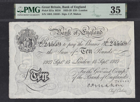 ENGLAND P.321a B216 1927 Mahon £10 140L Choice VF35