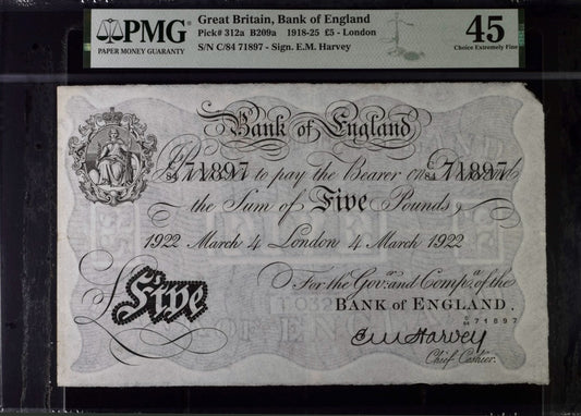 ENGLAND P.312a B209a 1922 Harvey £5 C84 Choice EF 45