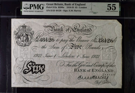 ENGLAND P.312a B209a 1922 Harvey £5 D25 AUNC 55