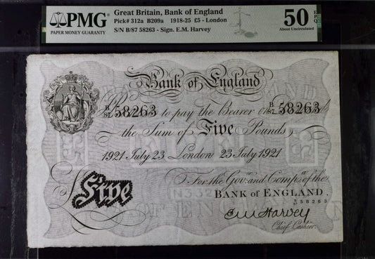 ENGLAND P.312a B209a 1921 Harvey £5 B87 AUNC 50 EPQ