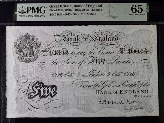 ENGLAND P.320a B215 1926 Mahon £5 336E GEM UNC 65 EPQ TOP POP
