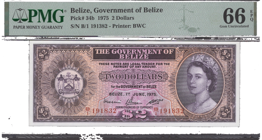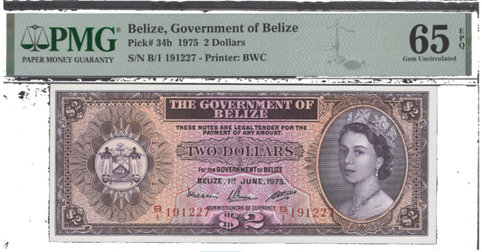 BELIZE P.34b 1975 $2 SUPERB GEM UNC 66EPQ