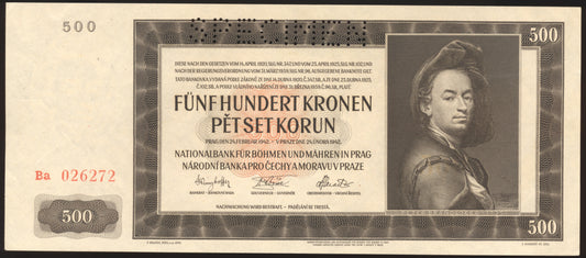 BOHEMIA & MORAVIA P.11s 1942 500 Korun UNC SPECIMEN