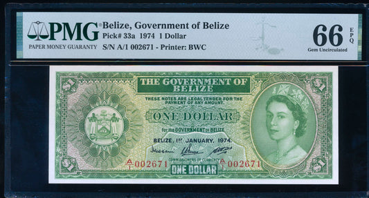 BELIZE P.33a 1974 $1 First series low serial number A/1 GEM UNC 66EPQ