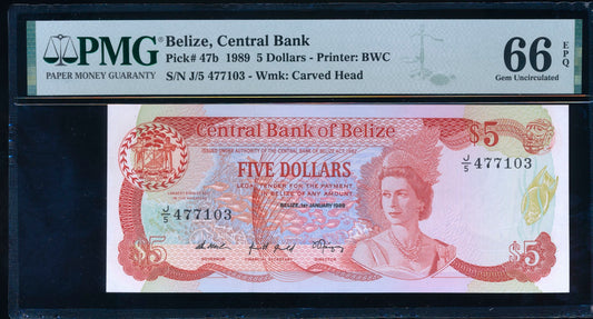 BELIZE P.47b 1989 $5 GEM UNC 66 EPQ