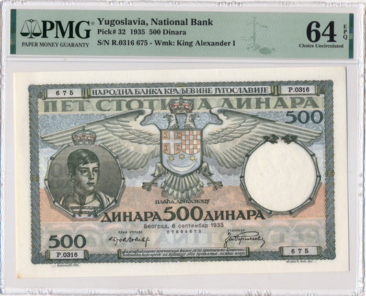 YUGOSLAVIA P.32 1935 500 Dinar Choice UNC 64 EPQ