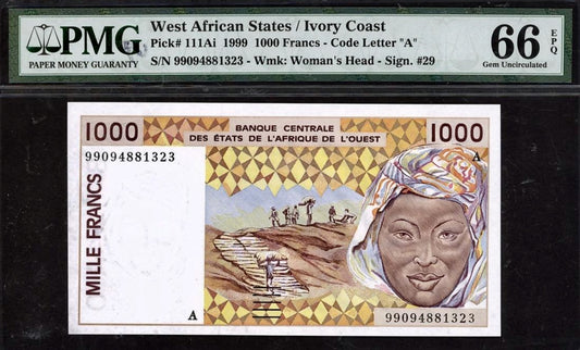 WEST AFRICAN STATES (Ivory Coast) P.111Ai 1999 1000 Francs GEM 66 UNC