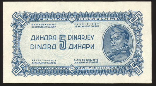 YUGOSLAVIA P.49b with thin security thread 1944. 5 Dinar UNC