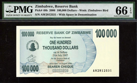 ZIMBABWE P.48b 2006 100,000 Dollars GEM 66 UNC