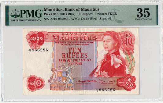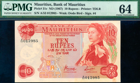 MAURITIUS P.31c 1967 10 Rupees Choice UNC 64EPQ A/53
