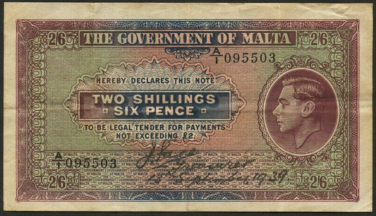 MALTA P.11 1939 2 Shillings 6 pence First series A/1 AVF