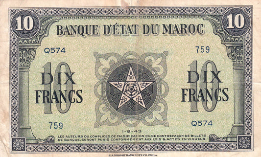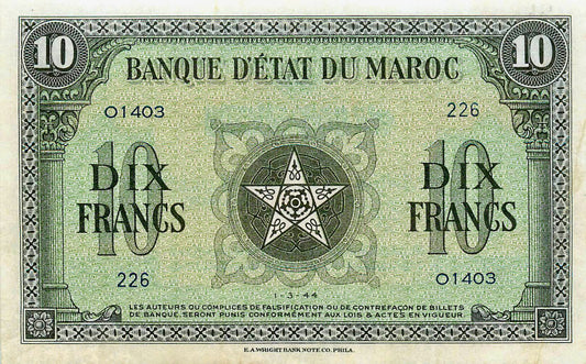 MOROCCO P.25a 1944 10 Francs GEF/AUNC
