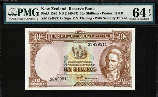 NEW ZEALAND P.158d 1960-1967 10 shillings CHOICE UNC 64 EPQ