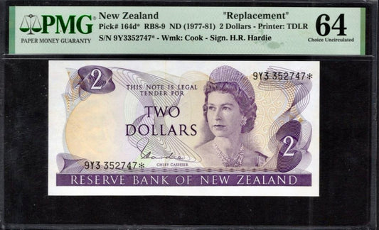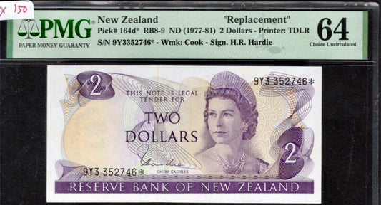 NEW ZEALAND P.164dr 1977-1981 $2 Replacement note Choice UNC 64