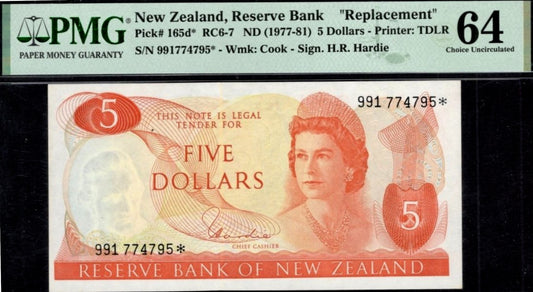 NEW ZEALAND P.165dr 1977-1981 $5 Replacement note Choice UNC 64