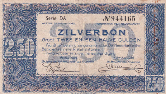 NETHERLANDS P.62 1938 2 1/2 Guilden GVF