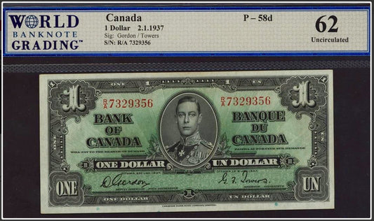 CANADA P.58d 1937 $1 Gordon, Towers 62 UNC
