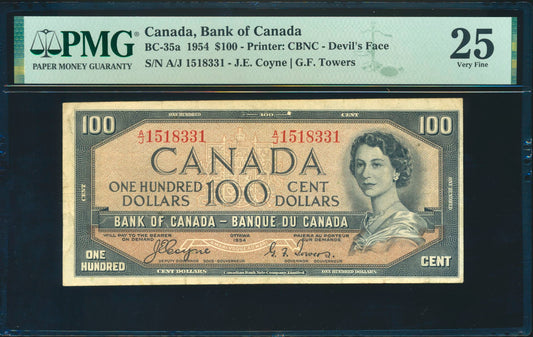 CANADA P.72a BC-35a 1954 $100 Coyne, Towers A/J VF 25