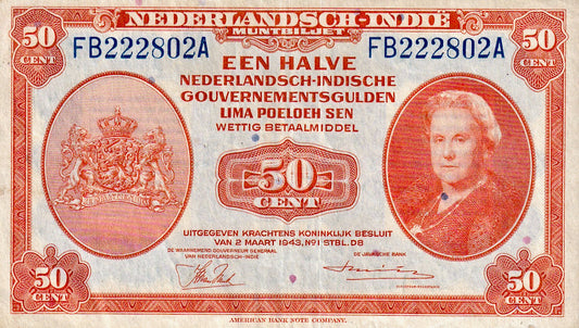 DUTCH EAST INDIES P.110a 1943 50 Cents GVF