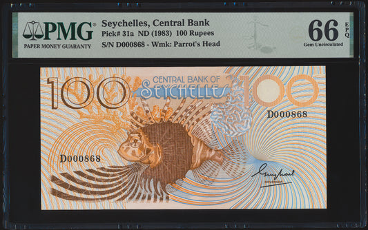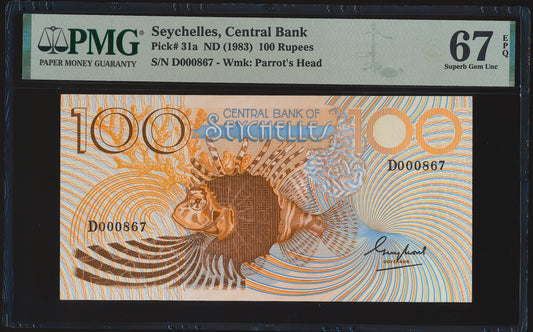 SEYCHELLES P.31a 1983 10 Rupees low serial number SUPERB GEM UNC 67 EPQ