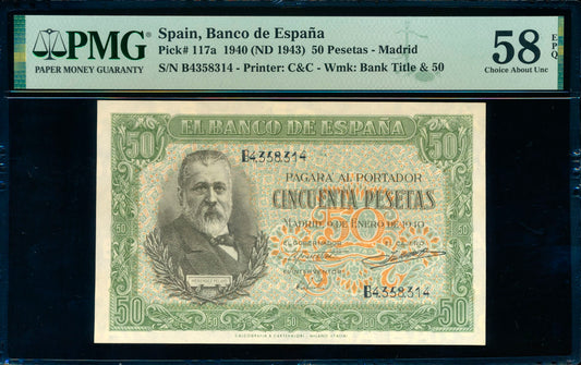 SPAIN P.117a 1943 50 Peseta Choice 58 EPQ AUNC
