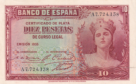 SPAIN P.86 1935 10 Peseta AUNC