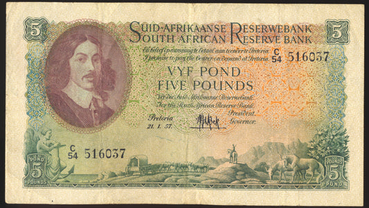 SOUTH AFRICA P.97c 1957 5 Pounds VF C/54