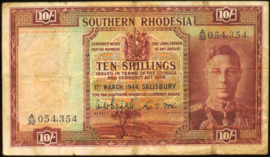 SOUTHERN RHODESIA P.9b 1944 10 Shillings AVF