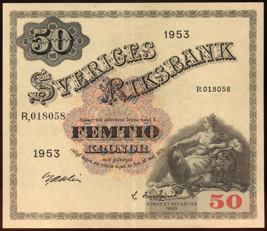 SWEDEN P.35af 1953 50 Kronor AUNC