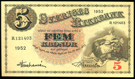 SWEDEN P.33ai 1952 5 Kronor AUNC